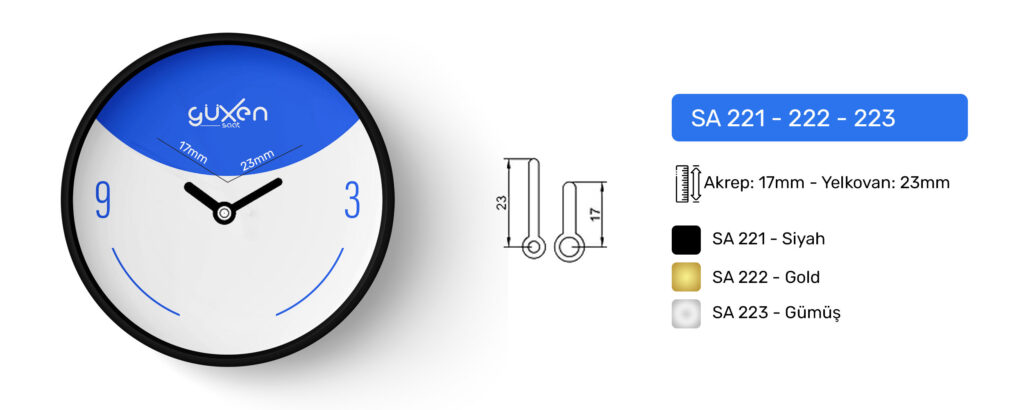 SA 221 gibi ürün kodlarımızla sunduğumuz bu eşsiz setlerle, zamanı kontrol altına alın ve mekanlarınıza estetik bir dokunuş katın. Hemen şimdi sitemizi keşfedin, en uygun saat mekanizması, akrep ve yelkovan setini seçin ve projelerinizi hayata geçirin!